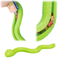 Stimulez votre animal de compagnie avec le waggle, Jouet interactif à mâcher, dans lequel des friandises peuvent être insérées. Fabriqué en caoutchouc naturel, résistant aux machoires puissantes. Le Treat Meter™ breveté distribue aléatoirement des friandises lorsque le jouet est remué ou secoué par votre chien Les picots peuvent être coupées avec une paire de ciseaux pour augmenter la quantité de distribution de friandises. Son centre super flexible fait du Waggle un jouet divertissant pour tous les chiens. Lavable au lave vaisselle (dans le panier du haut uniquement). Taille 7cmx19cmx7cm. 9€